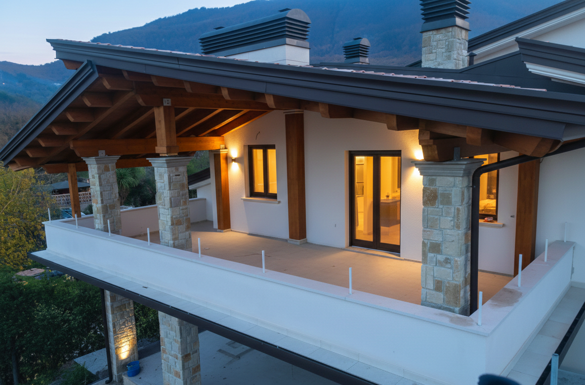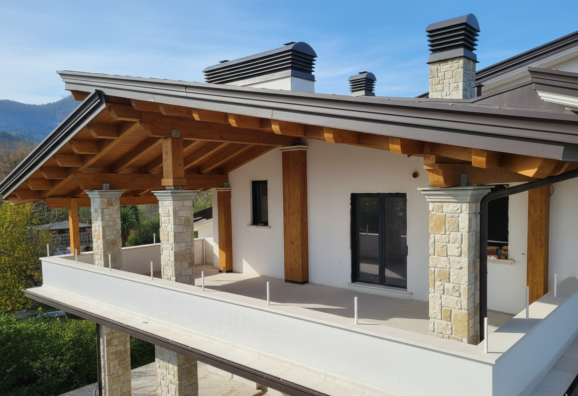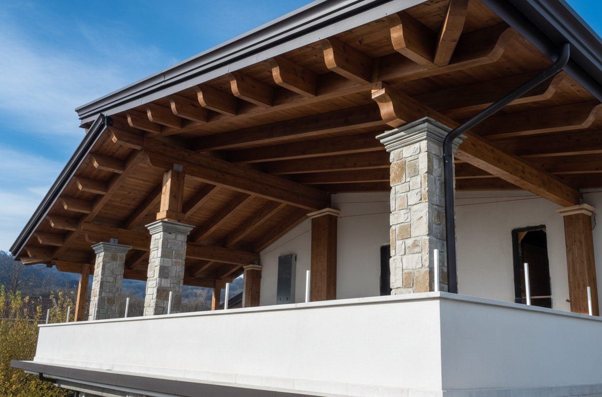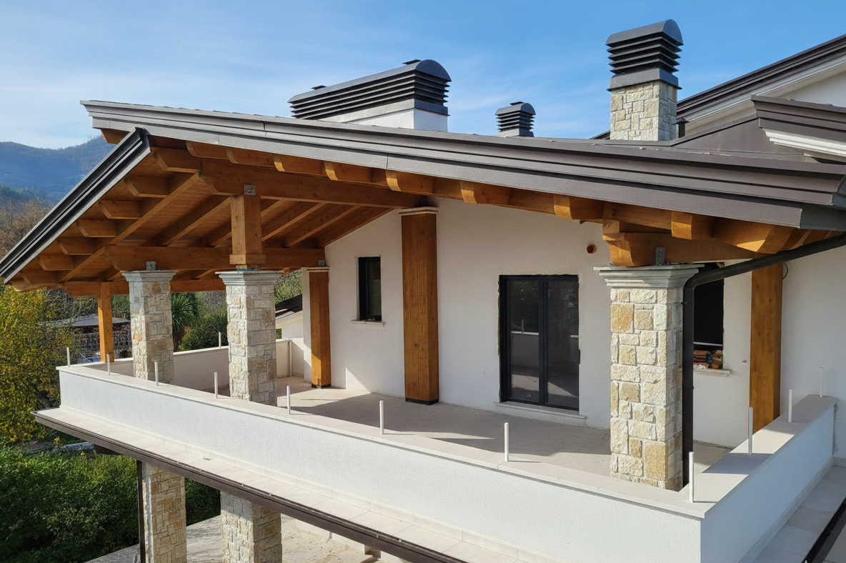 - Contrasto Materico: L’integrazione tra il calore del legno, la solidità della pietra locale dei pilastri e l’eleganza della lattoneria scura crea un equilibrio visivo perfetto.