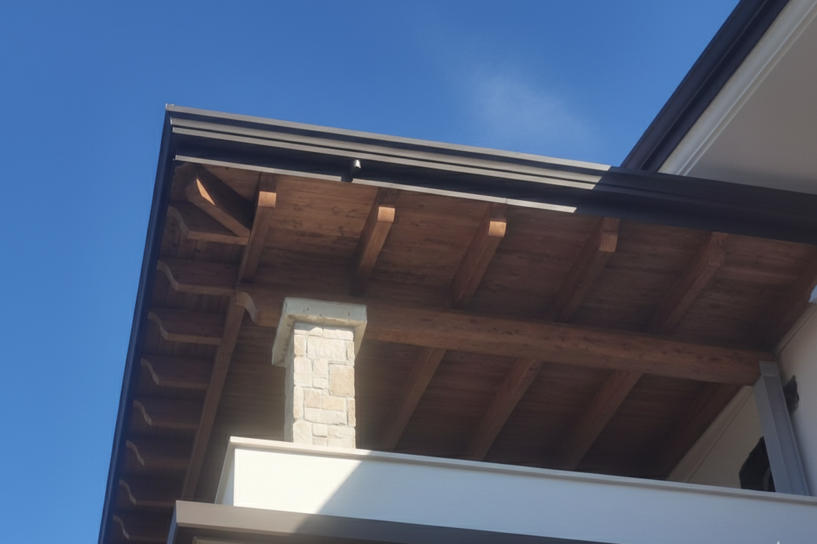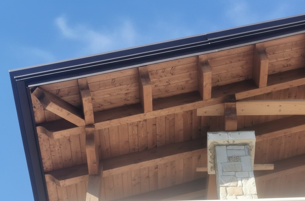 - Sagomatura Artigianale: Le testate delle travi sono lavorate con finiture di pregio che richiamano la tradizione, pur mantenendo linee pulite e moderne.